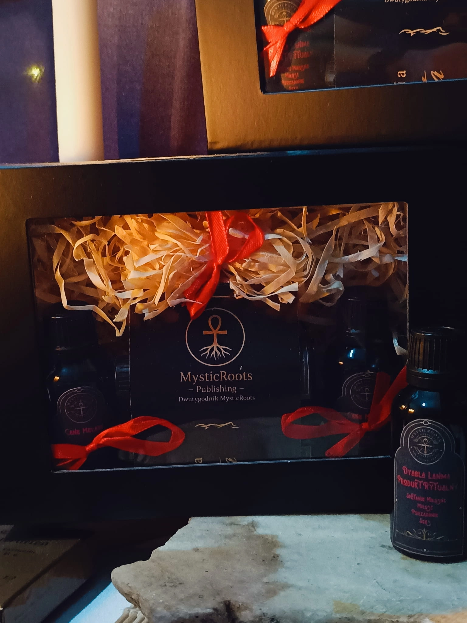 Całość została zamknięta w eleganckim, czarnym pudełku z magnetycznym zamknięciem i oknem ekspozycyjnym. Wnętrze wyłożone jest naturalnymi drewnianymi wiórkami, które chronią zawartość i nadają całości charakter rzemieślniczej skrzyni rytualnej. Każdy element zestawu jest ułożony ręcznie, dzięki czemu całość przypomina narzędzia przygotowane na ołtarzu.